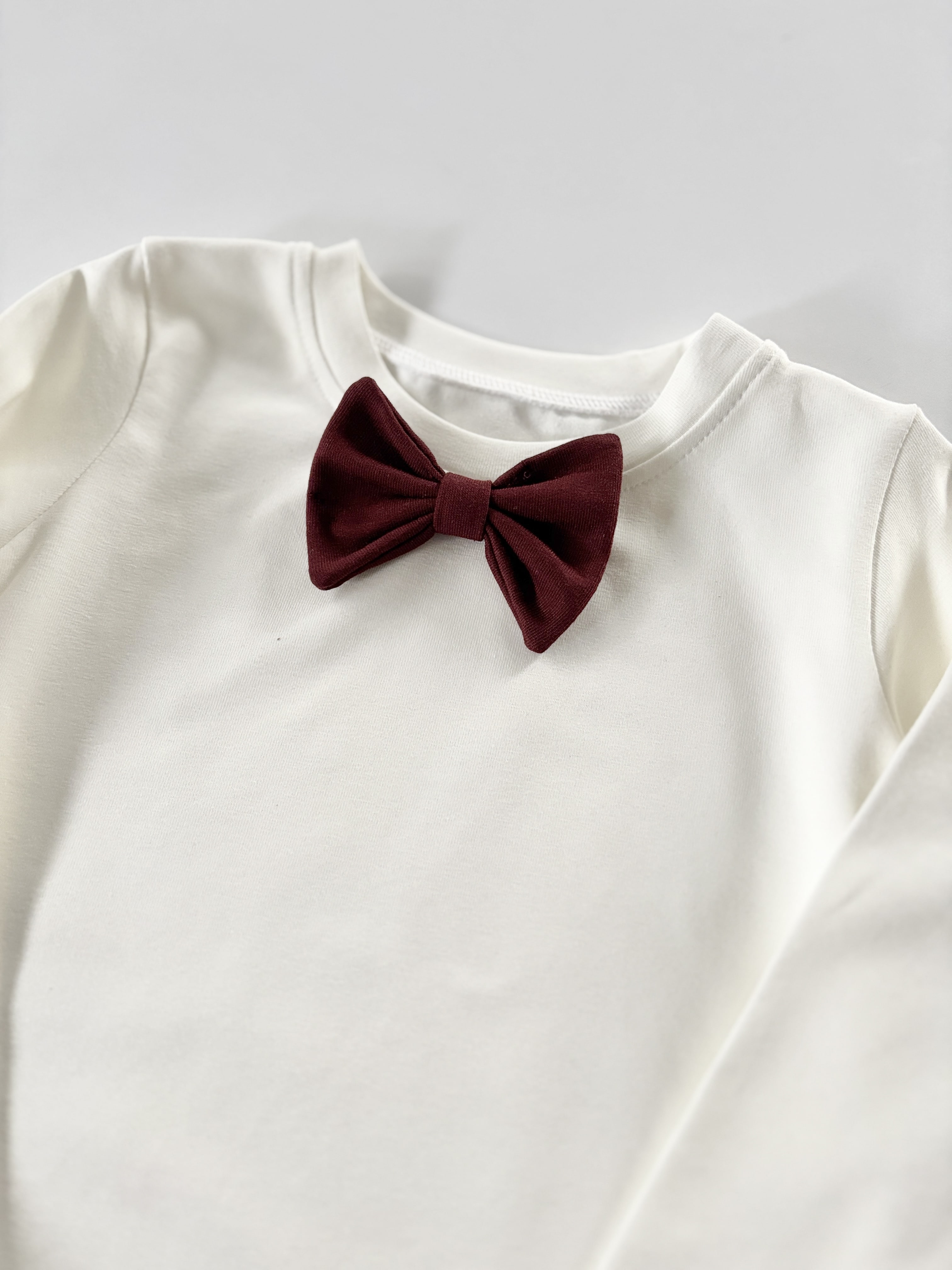 Stylowe i wygodne body z burgundową muchą to idealny wybór na wyjątkowe okazje, sesje zdjęciowe oraz rodzinne uroczystości. Wykonane z miękkiej, elastycznej dzianiny jersey bawełnianej, doskonale dopasowuje się do ciała dziecka, zapewniając swobodę ruchów i wysoki komfort noszenia. 💛