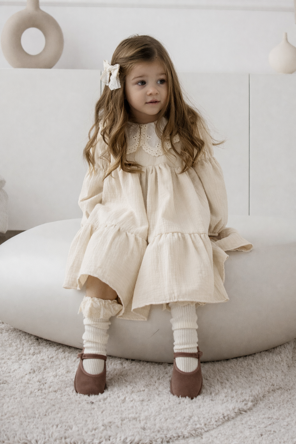 Delikatna i wygodna muślinowa sukienka dziecięca w kolorze kremowym z rozkloszowanym dołem to idealna propozycja dla małych dziewczynek 💛 Lekki muślin i swobodny fason zapewniają komfort podczas zabawy, spacerów i codziennego noszenia.