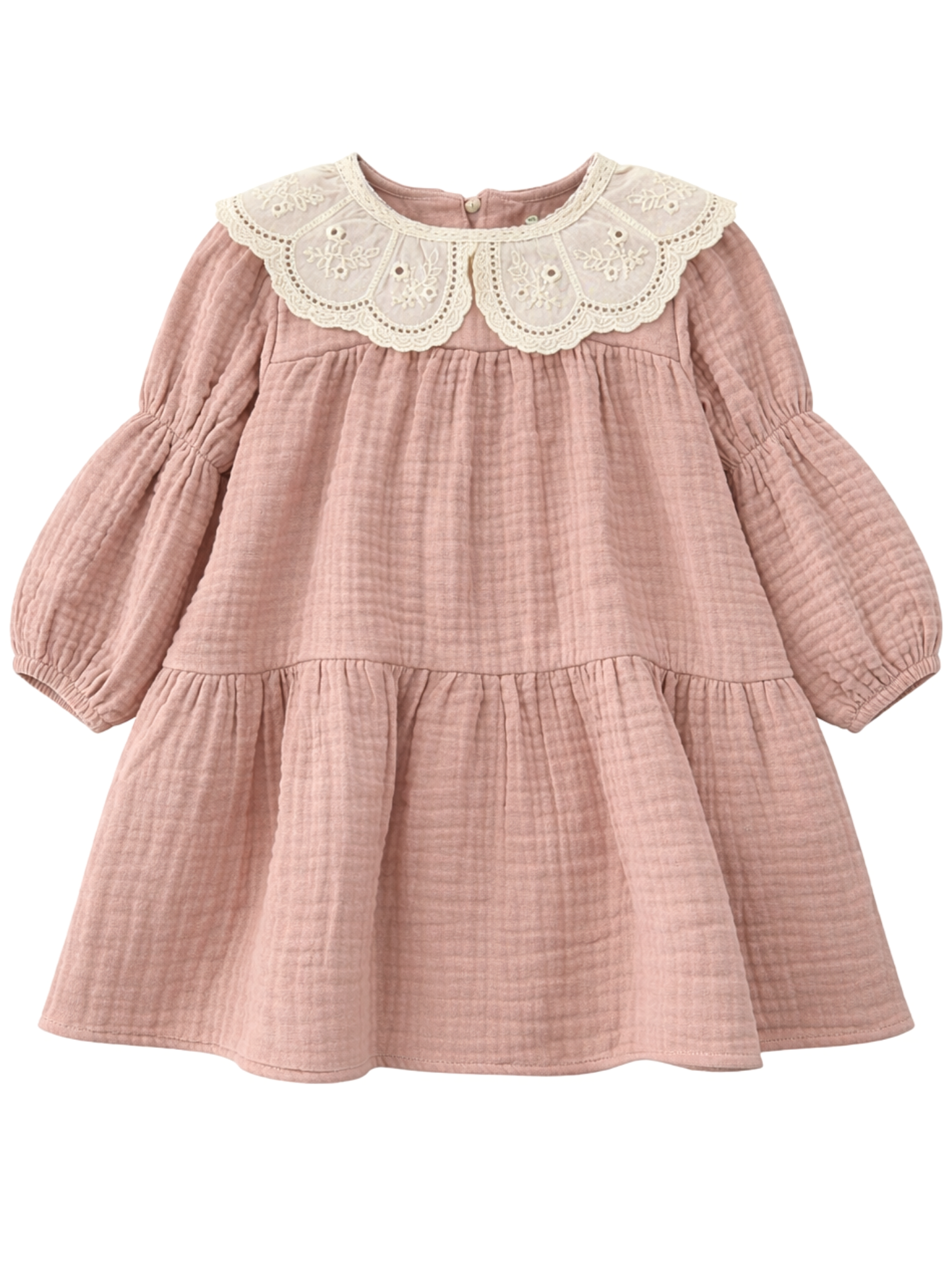 Elegancka i wygodna bawełniana sukienka z muślinu z kremowym, haftowanym kołnierzem to idealna propozycja dla małych dziewczynek 💛 Subtelny kołnierz dodaje klasy i delikatnego uroku, a naturalna bawełna zapewnia komfort przez cały dzień.