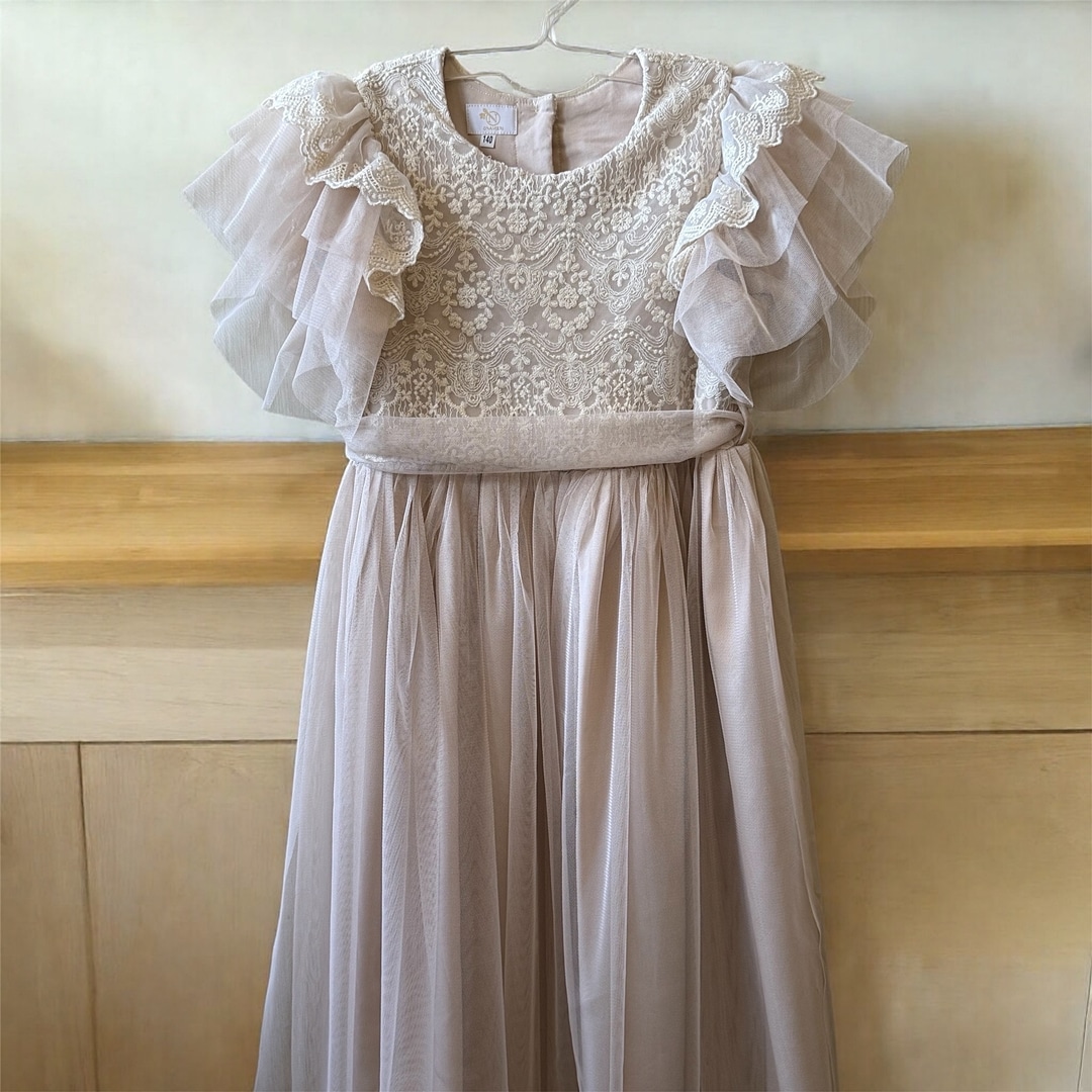 Odkryj wyjątkową sukienkę, która łączy w sobie dziewczęcy urok z eleganckim stylem. Beżowa tiulowa sukienka z koronkowymi detalami to idealny wybór na wszystkie ważne okazje, w których Twoja mała księżniczka pragnie błyszczeć ✨.