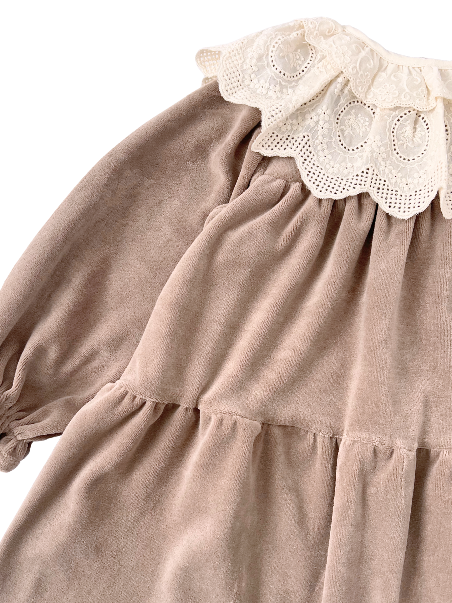 Welurowa sukienka w eleganckim, ciepłym odcieniu beżu to połączenie klasy, delikatności i wyjątkowego komfortu. Miękki, aksamitny materiał subtelnie mieni się w świetle, a kremowy haftowany kołnierzyk dodaje całości uroku rodem z bajkowej garderoby. To idealna propozycja zarówno na rodzinne uroczystości, jak i codzienne, stylowe wyjścia.